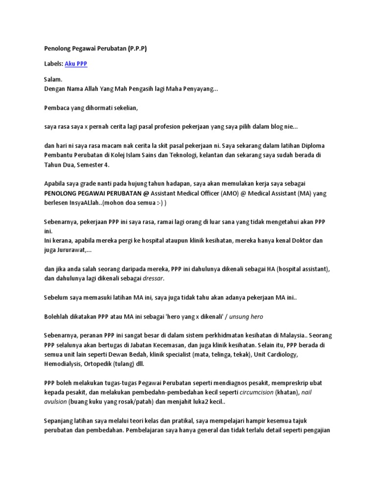 Mereka dituduh mengemukakan tuntutan palsu berjumlah. Latihan penolong pegawai perubatan merupakan salah satu daripada 12 latihan separa perubatan bertaraf diploma yang ditawarkan oleh kkm. Bil tajuk 1 kata aluan ketua penolong pegawai perubatan 2 ahli jawatan kuasa laporan tahunan 3 pengenalan. Latihan penolong pegawai kesihatan persekitaran. Penolong pegawai perubatan sebagai kerjaya pilihan buat lepasan spm yang melepasi syarat kelayakan kredit dalam beberapa matapelajaran seperti yang disyaratkan oleh suruhanjaya perkhidmatan awam (spa).